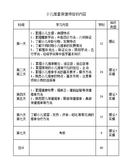 初級小兒推拿保健師培訓(xùn)時(shí)間為7天,共80學(xué)時(shí),保證學(xué)員學(xué)會(huì)小兒推拿保健基本理論和基本技能,培訓(xùn)合格頒發(fā)烏蘭察布醫(yī)學(xué)高等??茖W(xué)校培訓(xùn)合格證書。