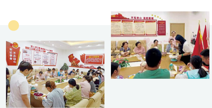在烘焙師的指導(dǎo)下,大家認(rèn)真學(xué)習(xí)制作蛋糕的技巧——摩拳擦掌,打奶油;躍躍欲試,搓餅干;專心致志,做花邊。大家紛紛自己動(dòng)手,用打蛋器打出純滑扎實(shí)的奶油,裹在蛋糕胚上,涂抹轉(zhuǎn)刮,將切成塊的各種水果一層層疊加,隨后點(diǎn)綴鮮花,一個(gè)個(gè)色彩斑斕的蛋糕映入眼簾。不少準(zhǔn)媽媽們將愛國主題元素融入到蛋糕中,既體驗(yàn)到了制作蛋糕的快樂。又激發(fā)身邊人愛黨、愛國的情懷!