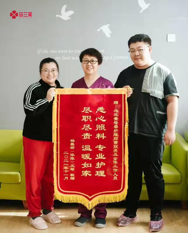 2021年11月即將滿(mǎn)一個(gè)月的月子生活,讓依依寶寶的媽媽難以忘懷,她親身體會(huì)到了烏蘭美醫(yī)養(yǎng)月子中心母嬰護(hù)理師曹麗英無(wú)微不至的關(guān)懷和照顧,感受了每一位工作人員飽滿(mǎn)的工作熱情。在寶寶滿(mǎn)月這天,特地給烏蘭美醫(yī)養(yǎng)月子中心準(zhǔn)備了禮物——一面寫(xiě)著“悉心照料,專(zhuān)業(yè)護(hù)理,盡職盡責(zé),溫暖如家”的感謝錦旗,錦旗充分表達(dá)了寶媽及家屬對(duì)烏蘭美醫(yī)養(yǎng)月子中心所有工作人員及母嬰護(hù)理師曹麗英深切的感激之情。